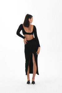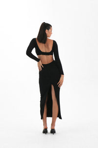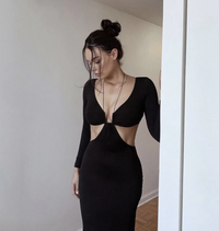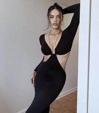 A halter neck, long sleeve dress with a centre back split. The neckline showcases effortless gathering with a 'U' wire feature.